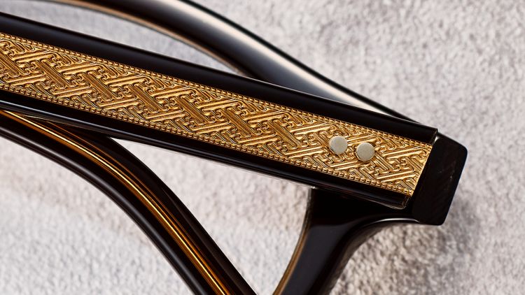透けて見えるテンプル芯や、テンプルやブリッジに施した彫金には、日本の伝統文様をモチーフにしたPRO’S CHOICEオリジナル柄を採用。ヨロイパーツ(ヨロイ=フロントの左右両端)やクラシカルな半マンレイ山シェイプのブリッジなど、細部にまで美しさを追求するアイヴァン社ならではのクラフトマンシップが息づいています。