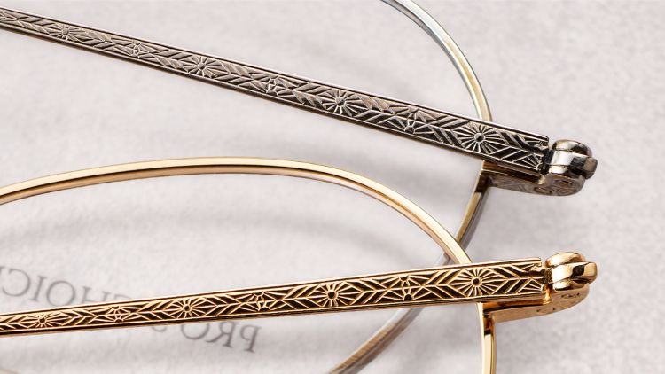 上リムに、内側の生地が微かに見える深さでカッティングを施し、フレームに立体感を出すことで、顔周りに立体的な印象をプラス。テンプル芯に施した彫金は、第1弾から引き続き、日本の伝統的な和柄をモチーフにデザインしたPRO’S CHOICEオリジナル文様です。