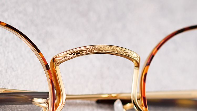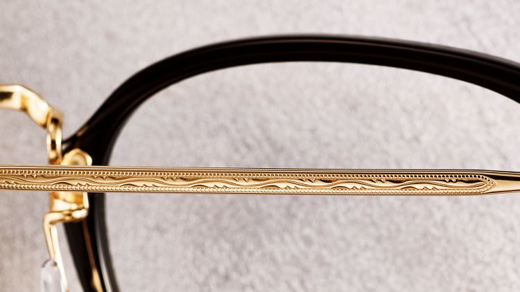 テンプル、ブリッジ、ヨロイは、アイヴァン社が得意とする日本の伝統的文様をモチーフにしたオリジナル柄の彫金を施しました。ブリッジは、ヴィンテージ感のあるマンレイ山のデザインをベースに、高さを抑えた緩やかなカーブで再構築。クラシックとモダンが調和した独特な表情を生み出します。